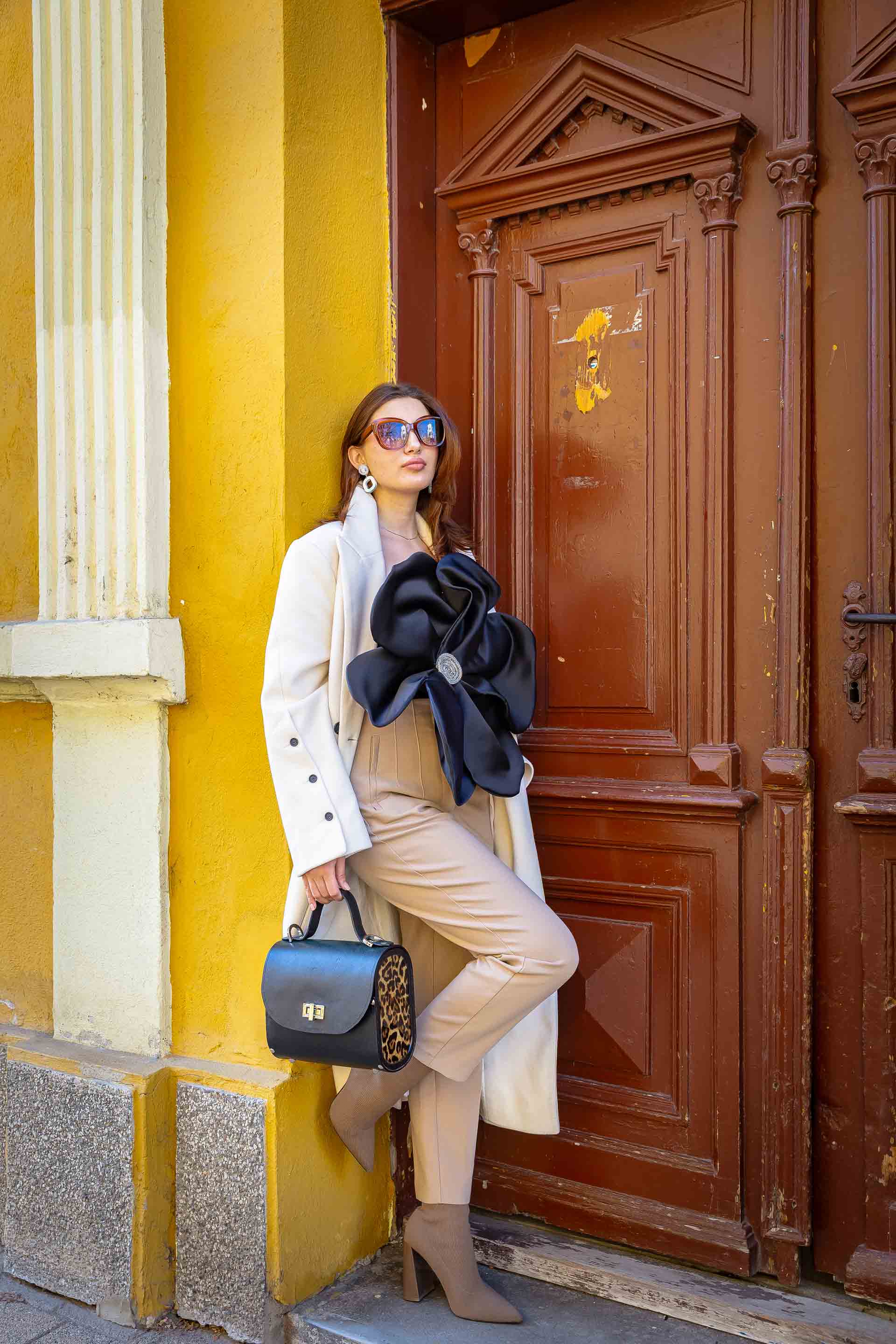 A handcrafted handbag made from premium black Italian cowhide leather, featuring a unique leopard-patterned side panel.